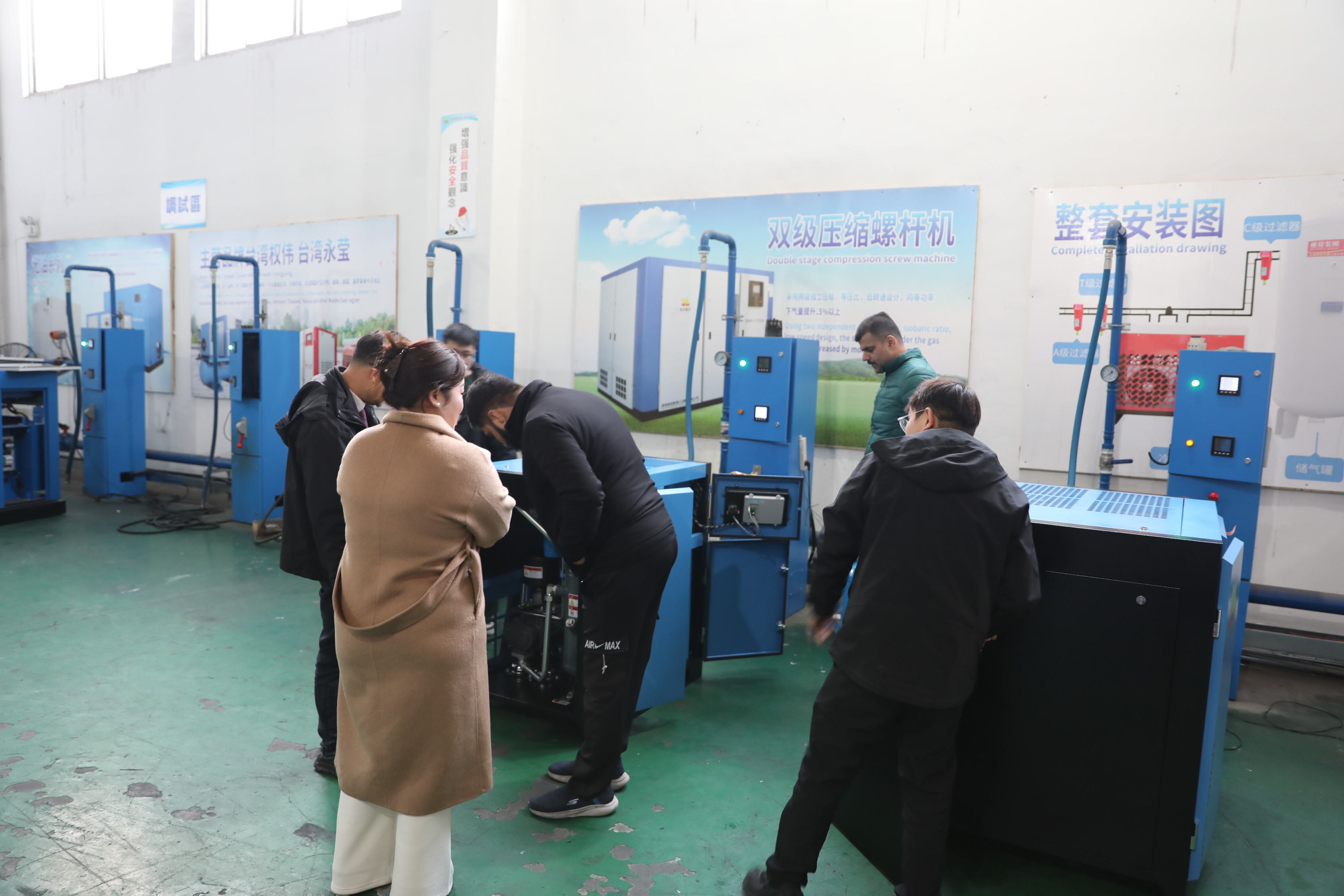 Accompanied by the heads of the Foreign Trade Department and Technical Department of Quanwei Machinery, the Pakistani customers visited the company's production workshop, product exhibition hall and R&D center successively. During the visit, the technical staff gave detailed explanations and demonstrations to the customers on the core technical parameters, production process flow, energy-saving advantages and customized solutions of the air compressors. The customers carefully observed the operation status of a variety of flagship products such as screw air compressors and permanent magnet variable frequency air compressors, and spoke highly of Quanwei Machinery's advanced production equipment, strict quality inspection standards and high product performance.